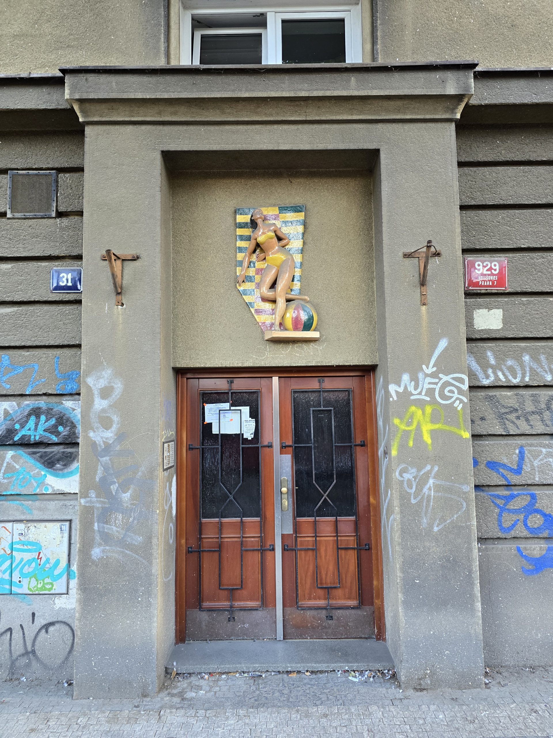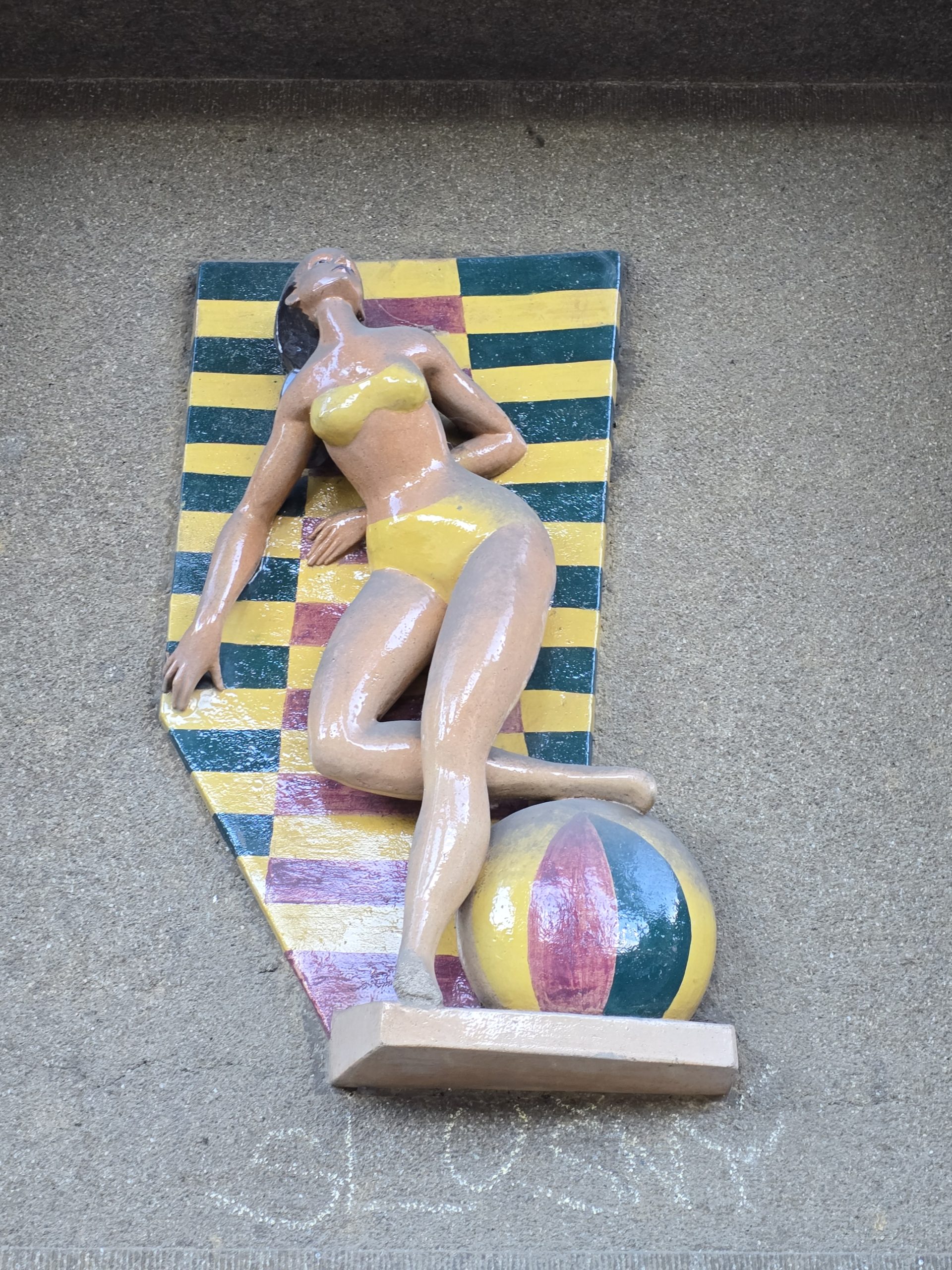 Die Fahrt zu einem Museum, auf dessen Dach ein Schädel sein soll, ist ergebnislos, offenbar ist der unbekannt verzogen. Schade. Dafür hat ein an sich eher schmuckloses Wohnhaus ungewöhnliche Kunstwerke über den Türen, wie dieses Bikinimädchen.