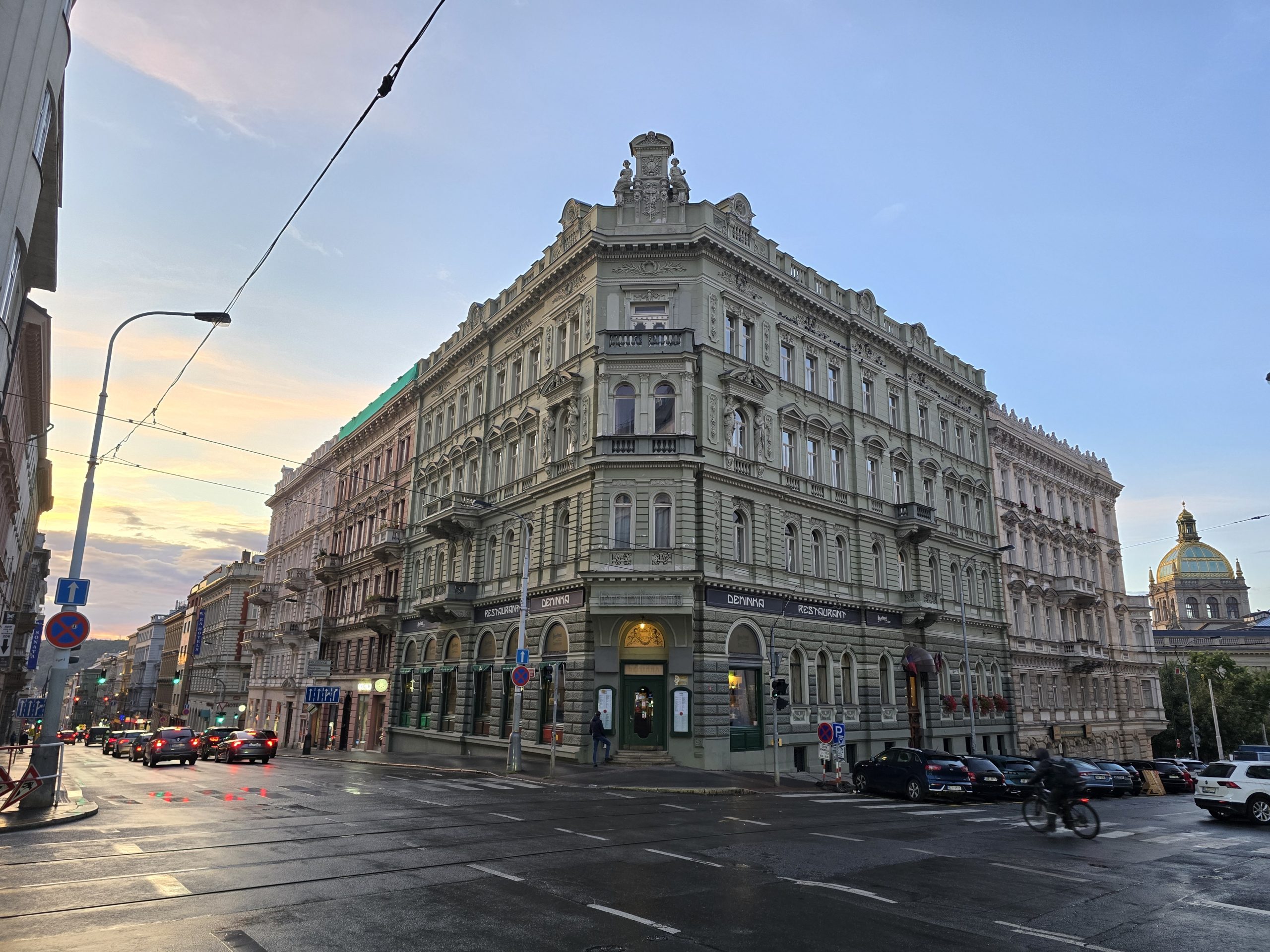 Heute spazieren wir ziellos vom Hotel los und landen gleich um die Ecke bei einem prächtigen Bau einer Frauen/Geburtsklinik. Weiter runter Richtung Fluß, und auf ein Frühstück ins Cafe Slavia. Klassiker, da kann man immer hin!