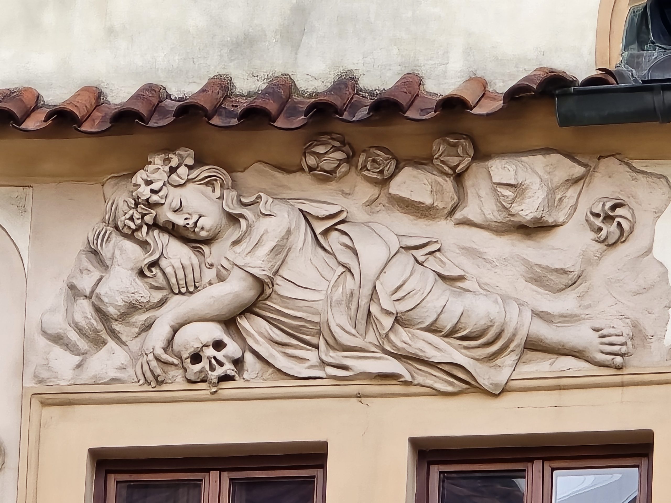 Danach fahren wir mit der Straßenbahn raus zum Krematorium und Urnenfriedhof Motol. Lauschiges Plätzchen, und Pilze hat es in Massen. Das Wetter ist nicht so toll, aber die Bäume halten den Regen halbwegs ab. Zurück in die Stadt hüpfen wir nochmal raus aus der Straßenbahn und schauen uns einen alten Friedhof an. Wenigstens einen Schädel hat es, immerhin.