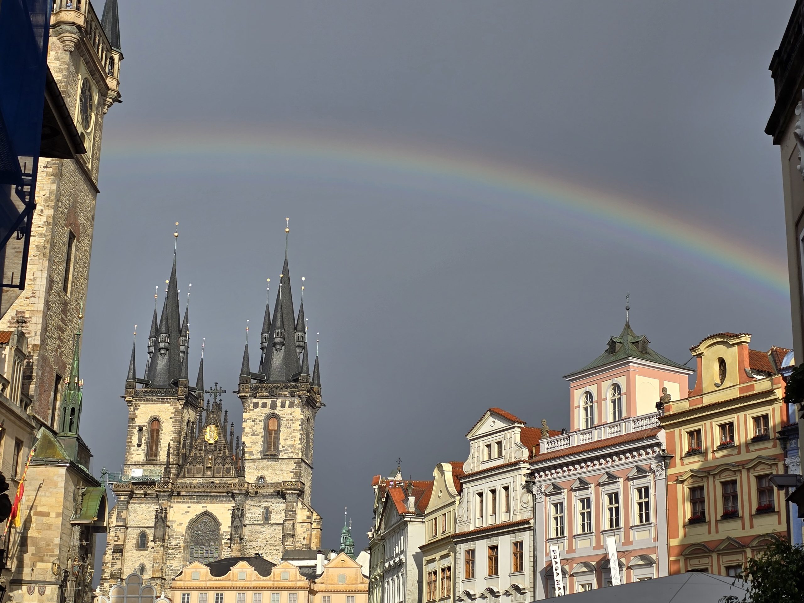 Spontan noch ein Regenbogen, und zufällig entdecken wir in einer Fassade sogar noch einen Schädel.