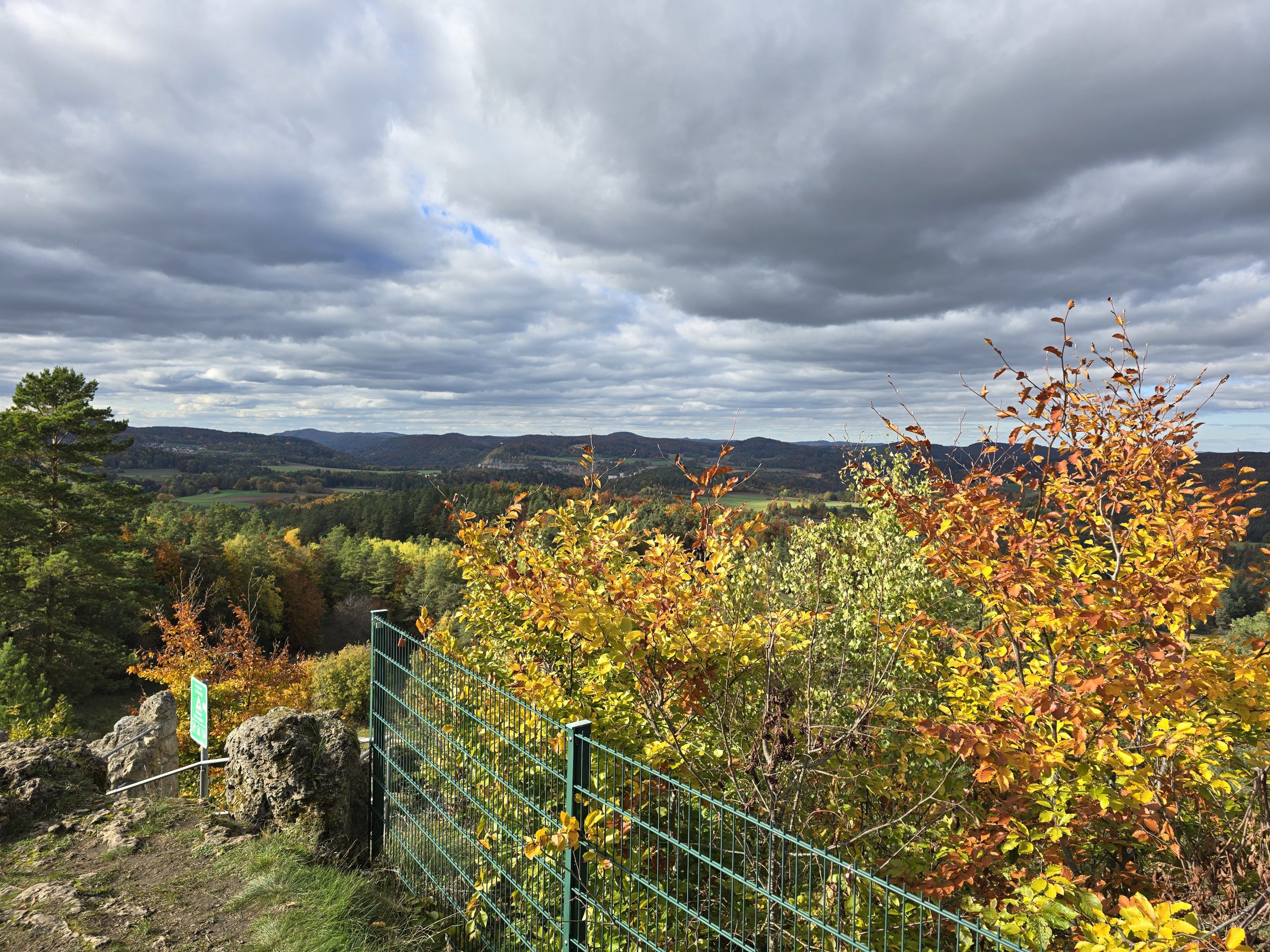 Die folgende Etappe ist schweißtreibend, mehr als 200 Höhenmeter geht es hoch zur Burgruine Lichtenegg. Vorbei an Holzarbeiten, es hat noch regen Flugbetrieb, Pilze natürlich, und endlich die Ruine, die uns mit erstklassiger Aussicht belohnt. Hier vernichten wir den Rest der Wegzehrung, vor wir die letzte Etappe angehen.