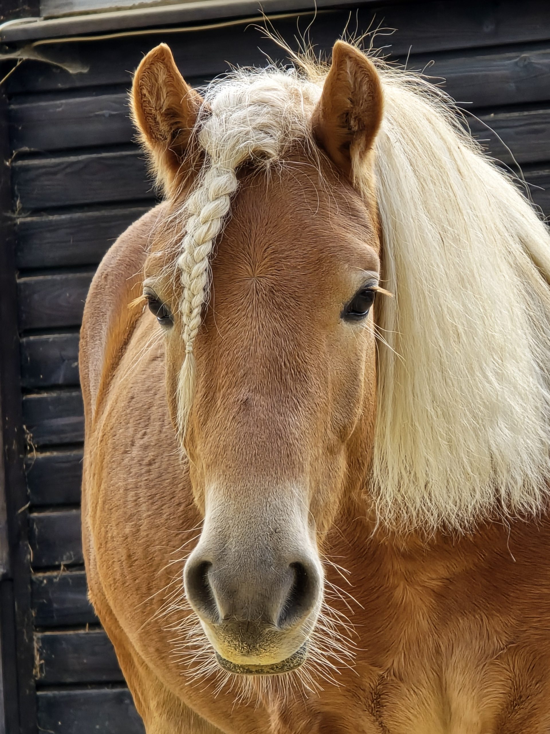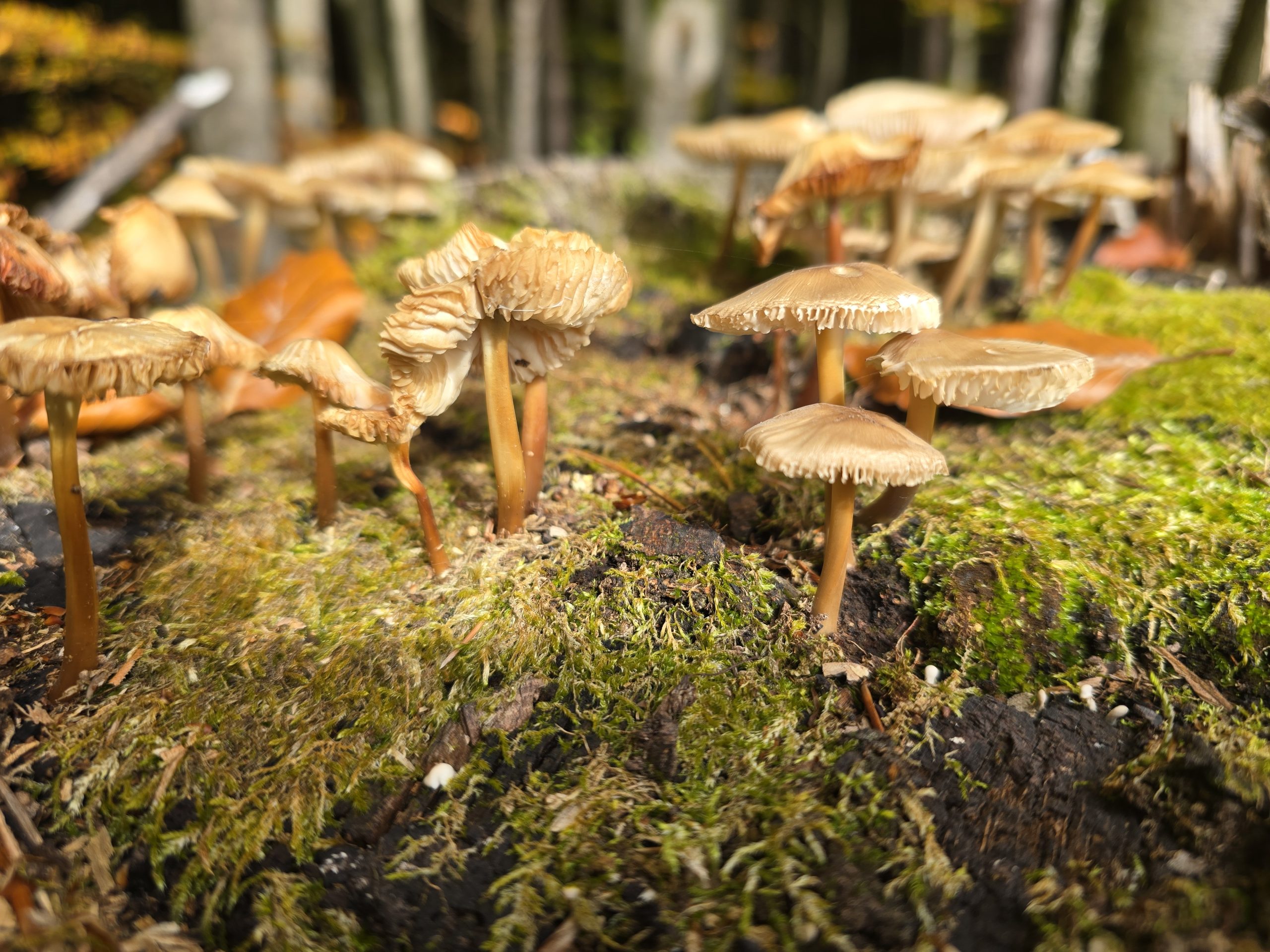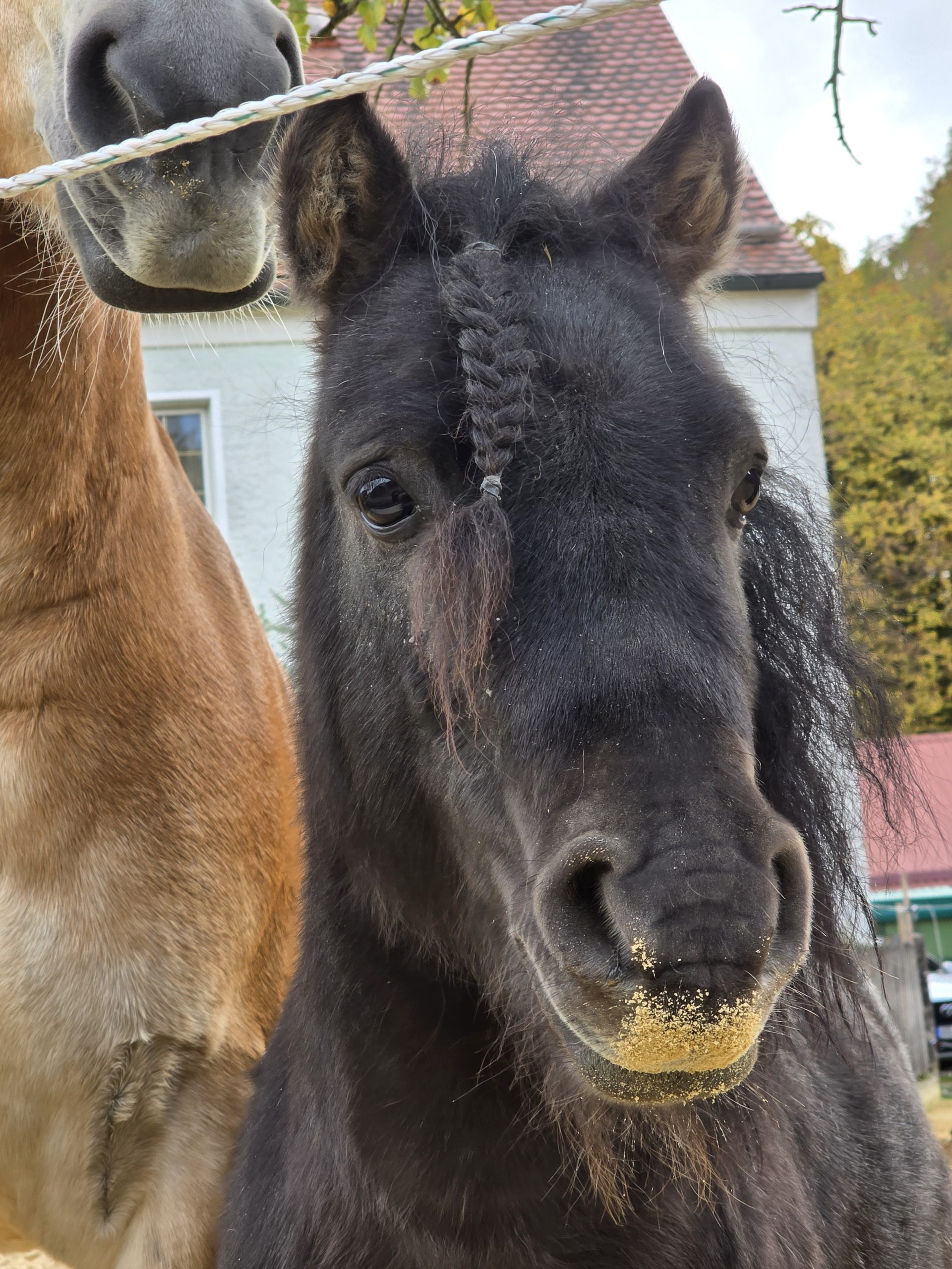 Pilze hat es in rauher Menge, wir halten eine erste kleine Rast und verspeisen etwas Wegproviant, vor wir zwei bezopfte Pferde passieren.