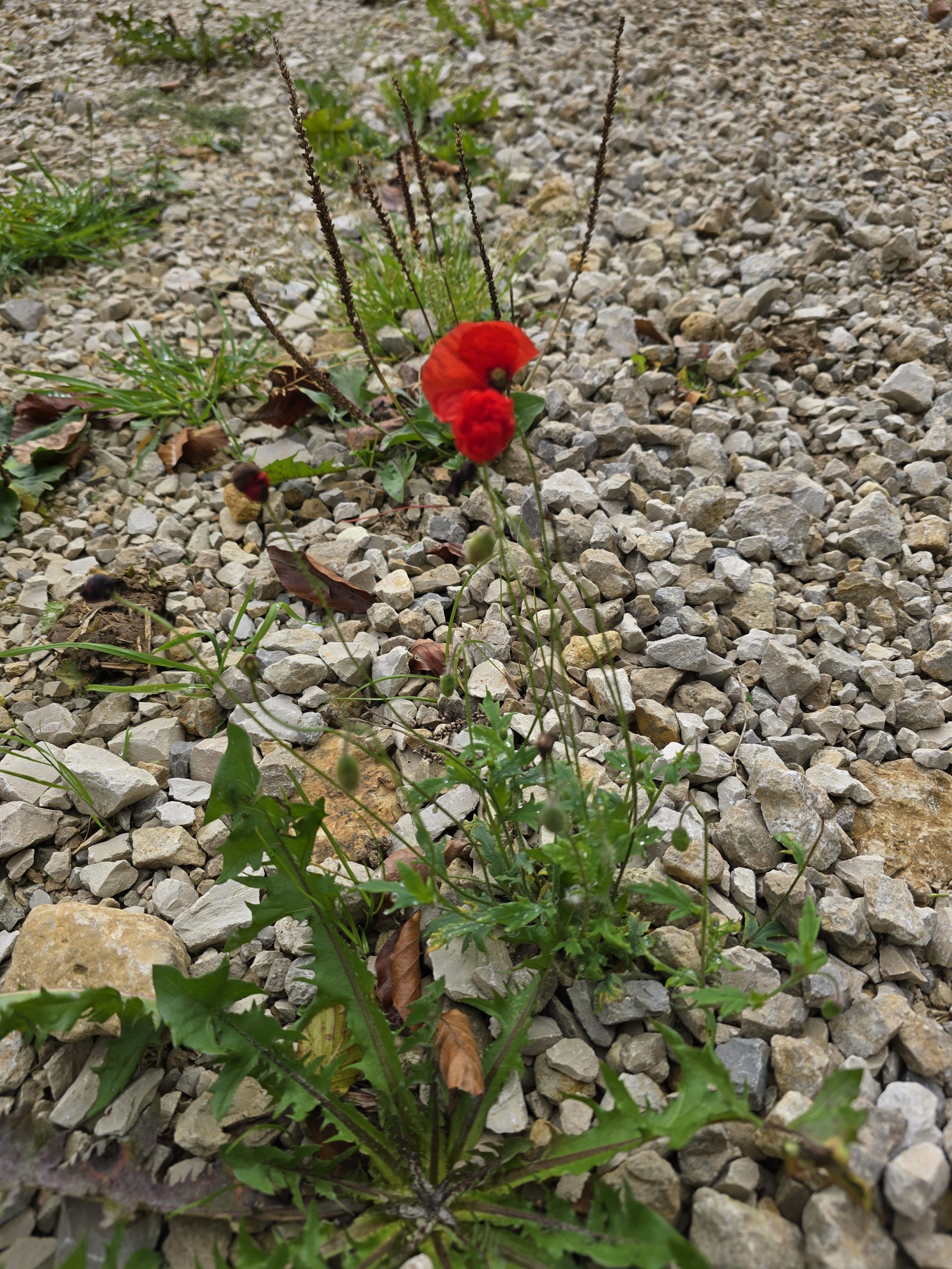 Heute ist Wandertag! Mit einem roten Zug fahren wir raus nach Neukirchen b.S.R. Dort wird man gleich mal von einer mahnenden Tafel empfangen. Und schon auf den ersten Metern begrüßt uns Mohn im Schotter!