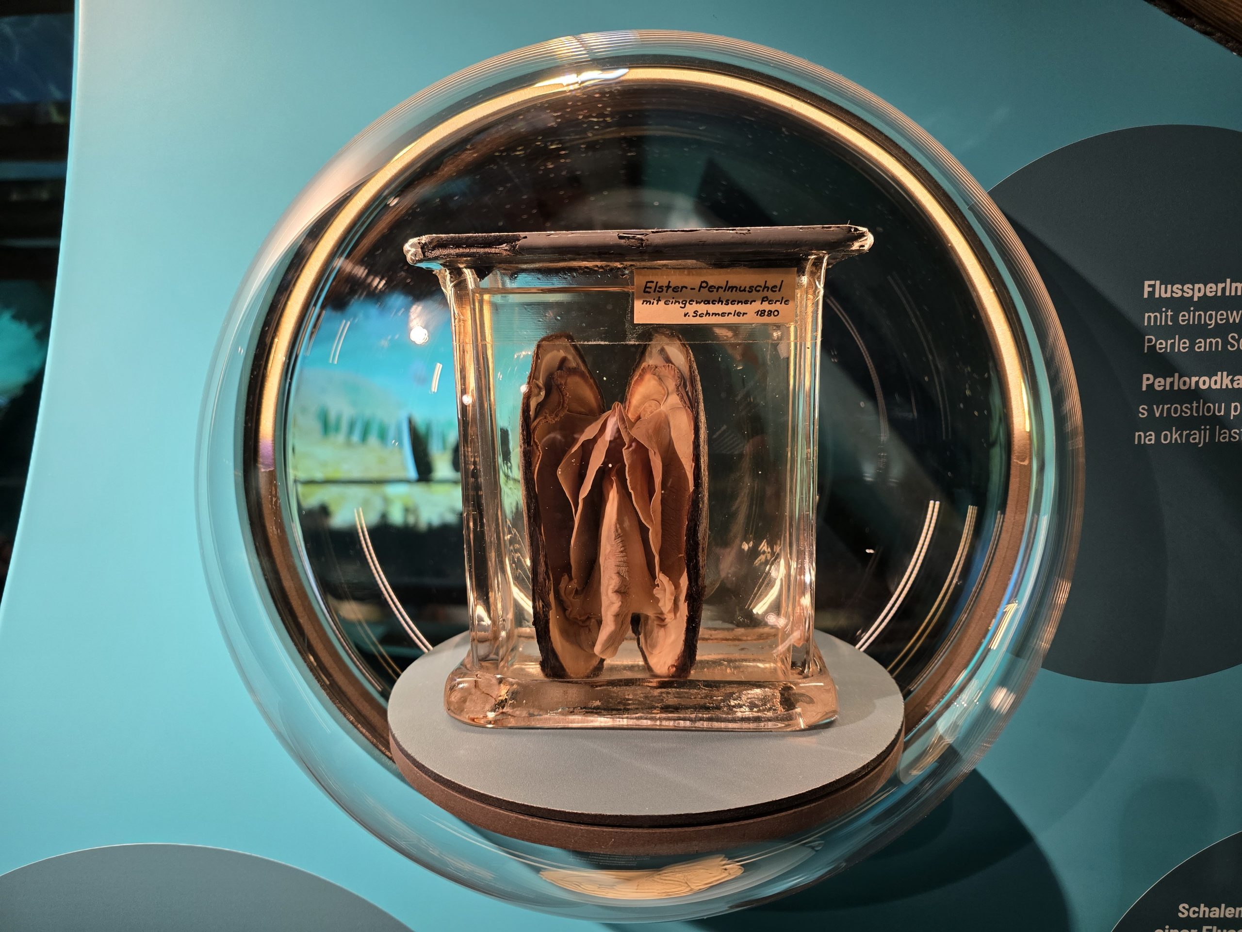 Eine schöne Schau rund um die Flußperlmuschel, die eingewachsene Perle kann man links oben erahnen. Eine phantastische Ausstellung, Lebenszyklus und Lebensraum der Flußperlmuschel, Zucht und Nutzung, dazu die damaligen Produkte in ihrer vollen Pracht, und sogar Einkaufsmöglichkeit zu angenehmen Preisen – definitiv den Besuch wert!