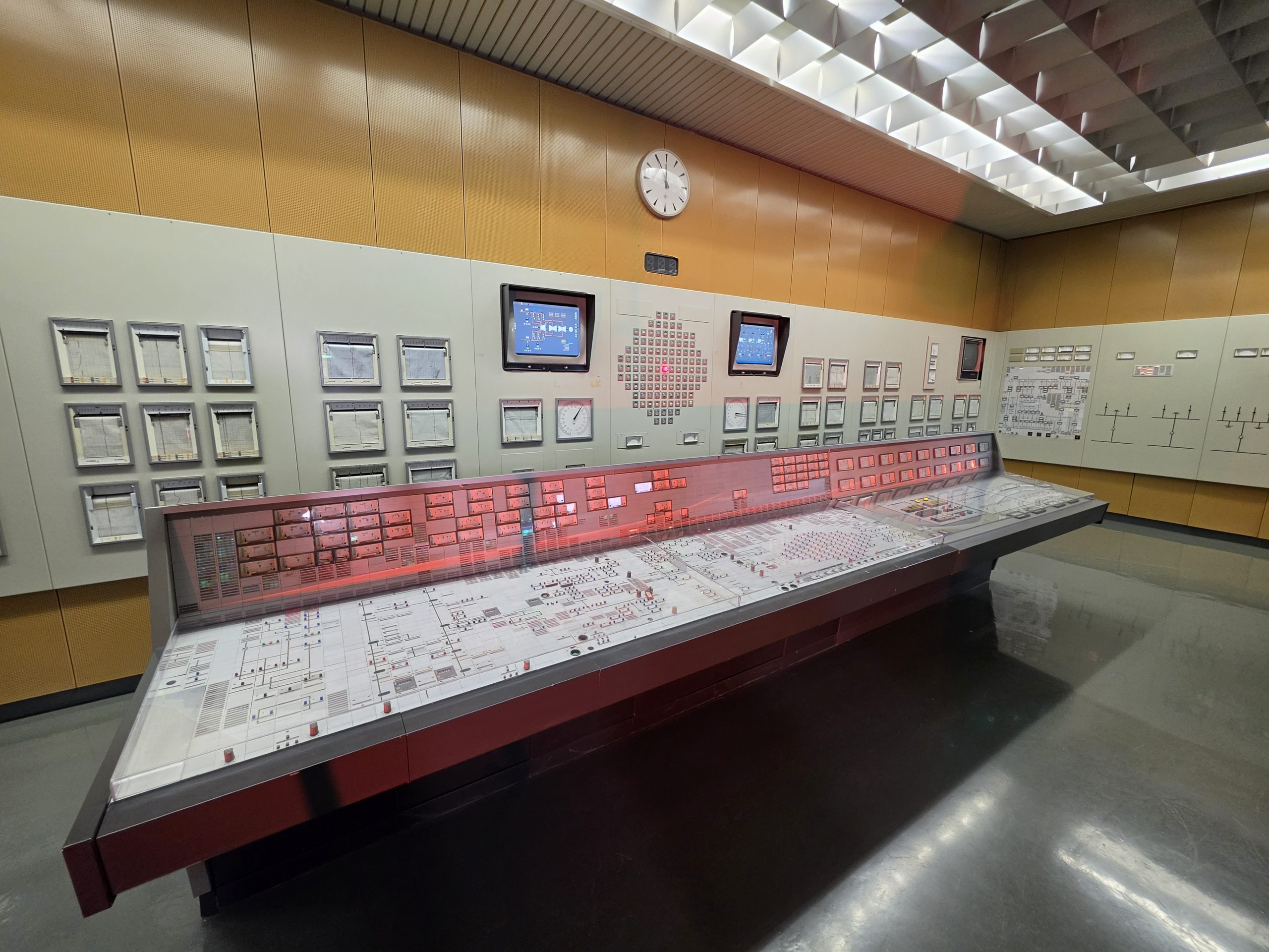 Die Hinfahrt funktioniert staufrei, und kurz vor dem Ziel kommen wir erst mal an einem Kohlekraftwerk vorbei, welches allerdings auch bereits stillgelegt ist. Da wir gut in der Zeit liegen gehen wir auf ein Bierchen in eine Ausflugsgaststätte gleich neben dem AKW. So gestärkt können wir zur Führung antreten. Nach dem Einführungs-Vortrag und einem Werbefilm aus den 70ern noch kurz ein Gruppenphoto, und schon geht es rein. Erste Station sind gleich mal die Strahlungsdetektoren, bei denen im Regelbetrieb jede Person beim Betreten und Verlassen gemessen würde.