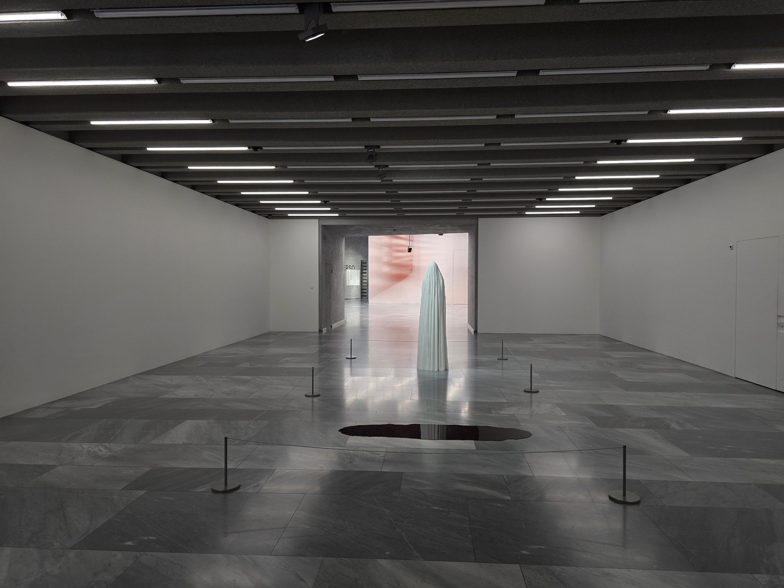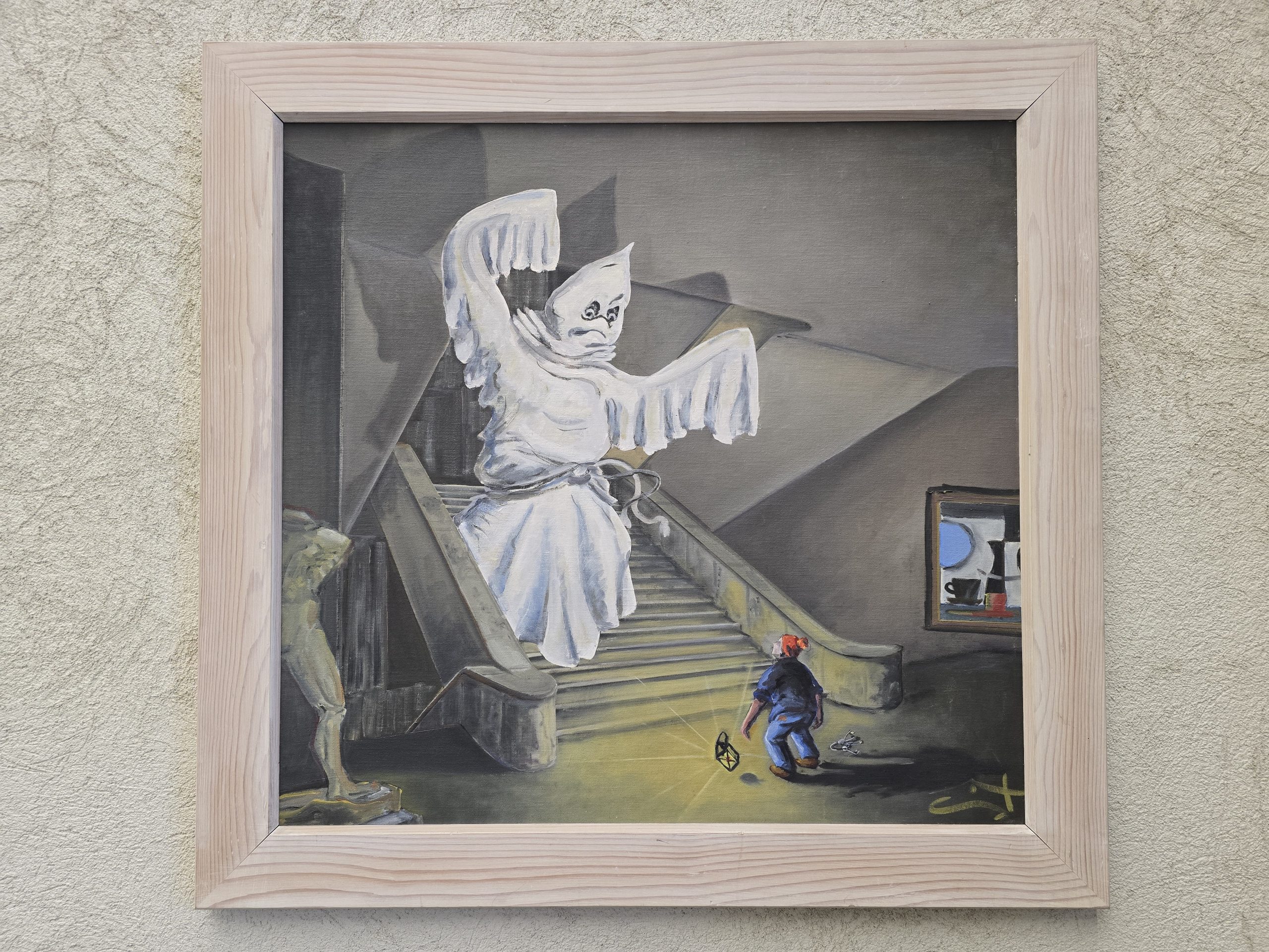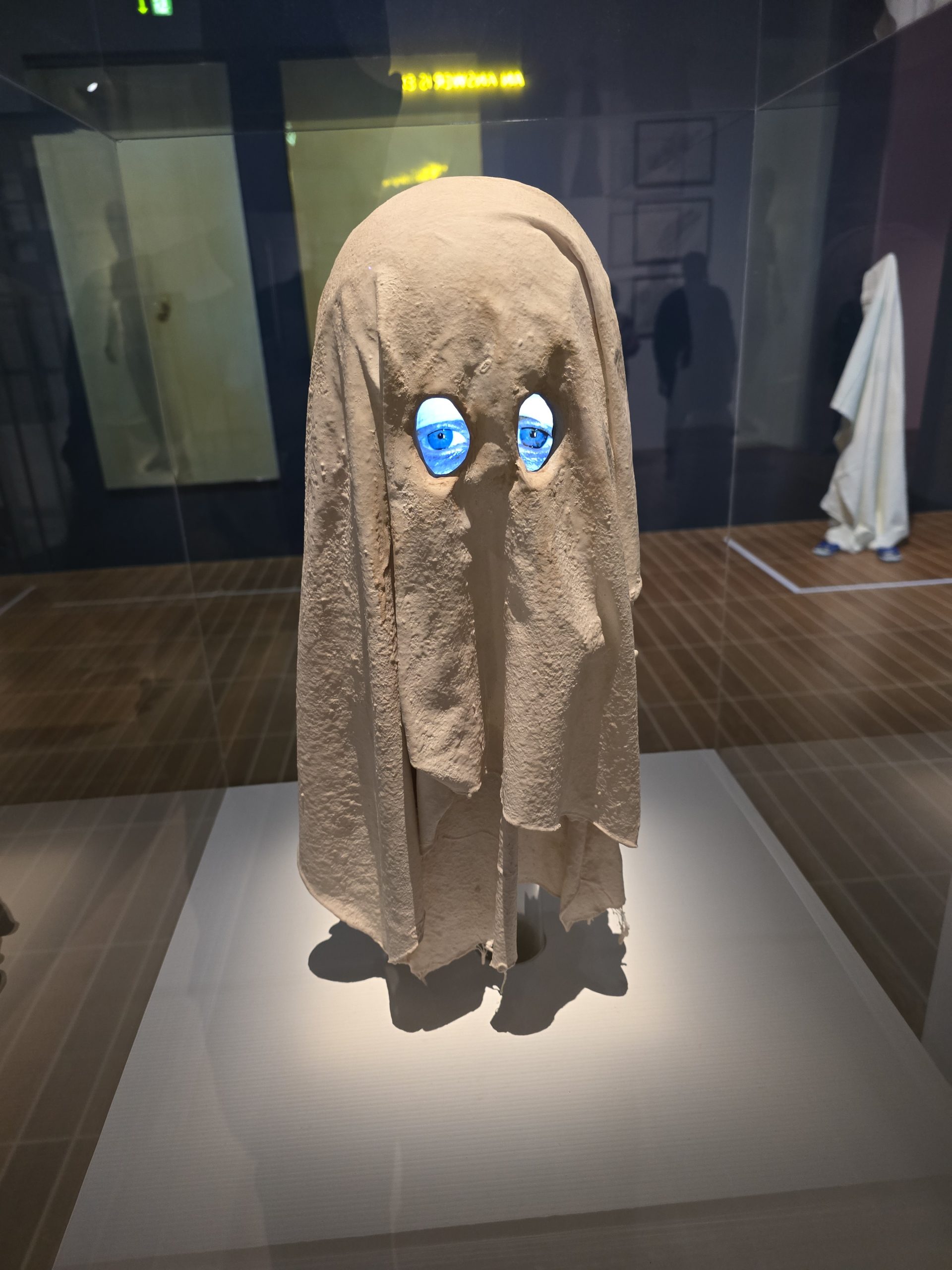 Schön gemacht, eine bunte Mischung aus Gemälden, Skulpturen und Installationen zum Thema. Sogar von den Aufsichten hat jemand ein Gemälde beigesteuert, und man wird dann gleich standesgemäß empfangen. Toll gerarbeitet diese Geist aus Marmor, der Effekt der Geisterkleidchen ist auch genial, und der Kollege hier blinzelt einem freundlich zu.